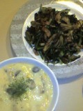 シメジとエリンギが入ったシチューと、ほうれん草とキノコ(しいたけ、シメジ、マイタケ)のソテーです。